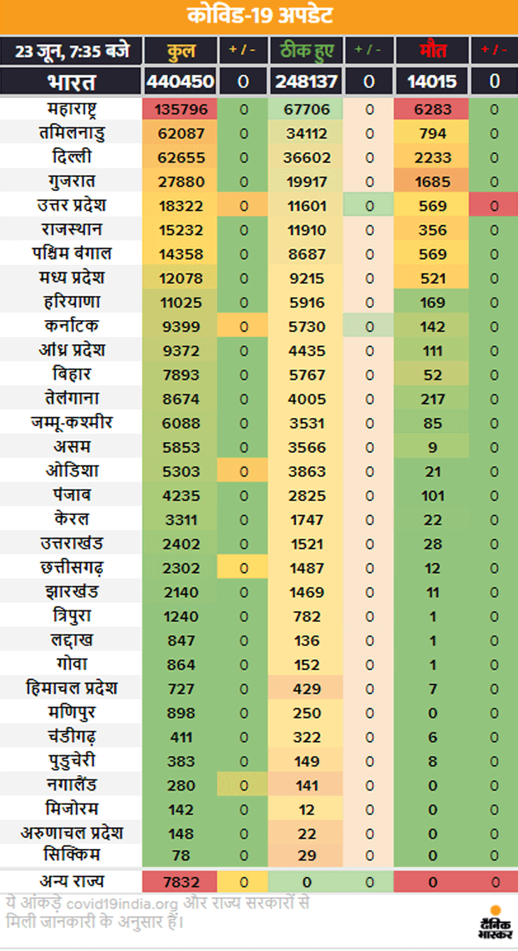अब तक 4.40 लाख केस: 24 घंटे में 13 हजार 548 मरीज बढ़े, यह 5 दिन में सबसे कम; 10 हजार 879 संक्रमित भी ठीक हुए